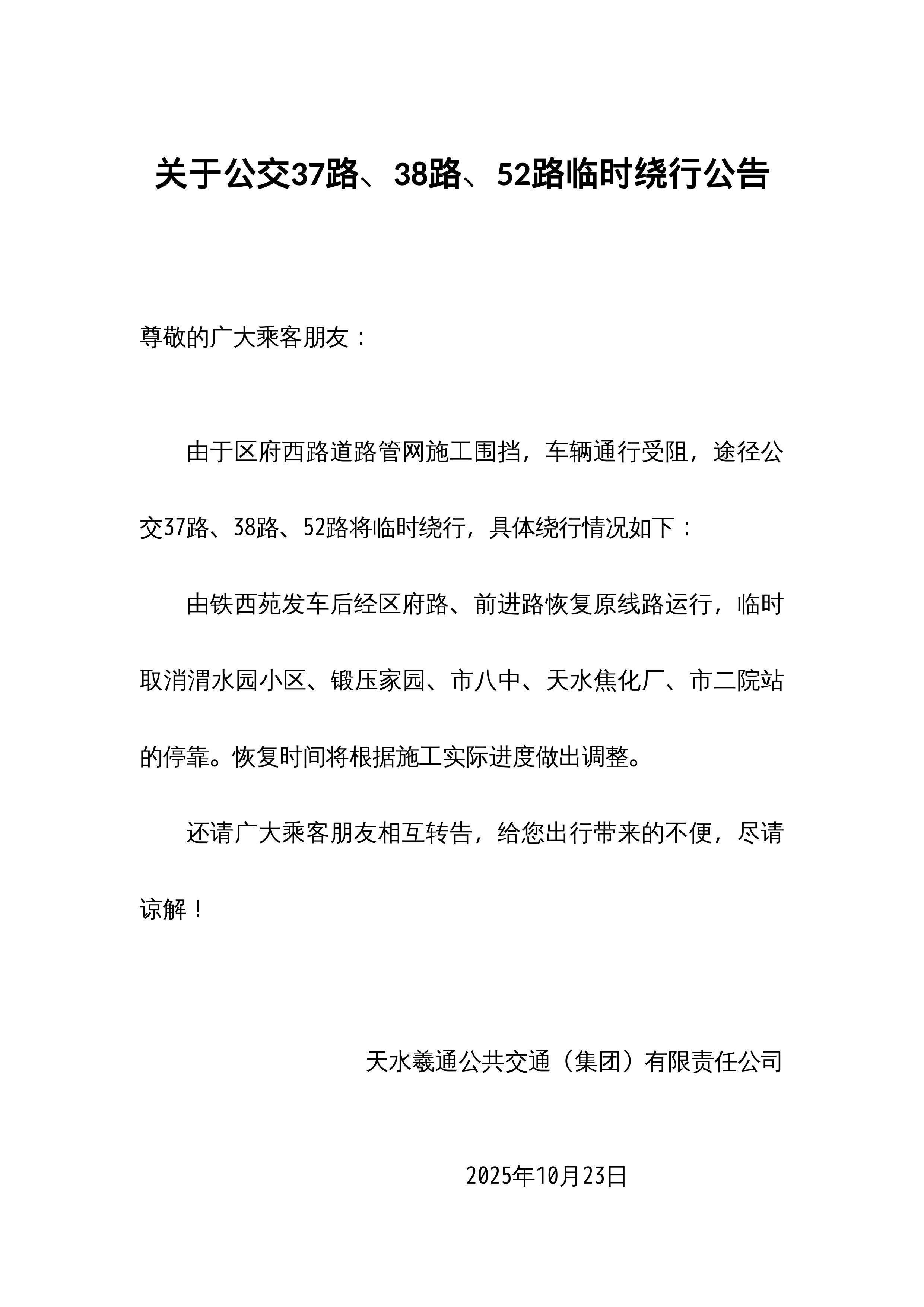 關(guān)于公交37路、38路、52路臨時(shí)繞行公告